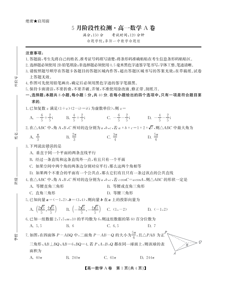 安徽省鼎尖名校2024-2025学年高一下学期5月联考试题数学A卷