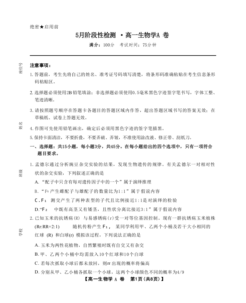 安徽省鼎尖名校2024-2025学年高一下学期5月联考试题生物(A)+答案