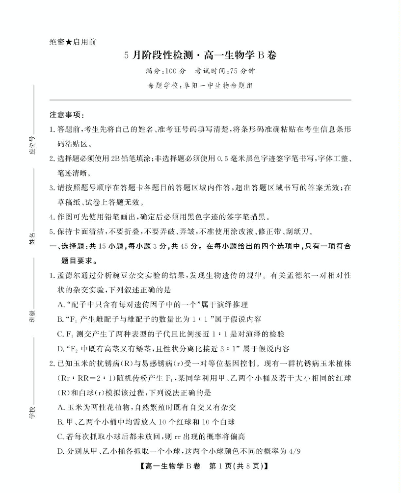 安徽省鼎尖名校2024-2025学年高一下学期5月联考试题生物(B)+答案