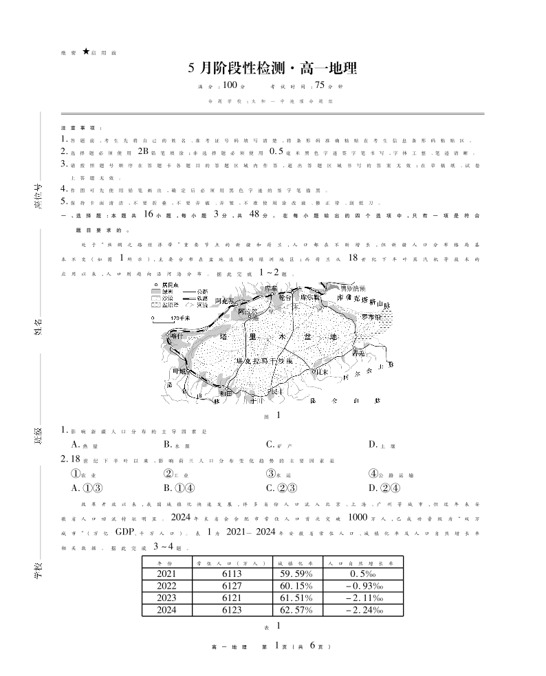 安徽省鼎尖名校2024-2025学年高一下学期5月联考试题地理