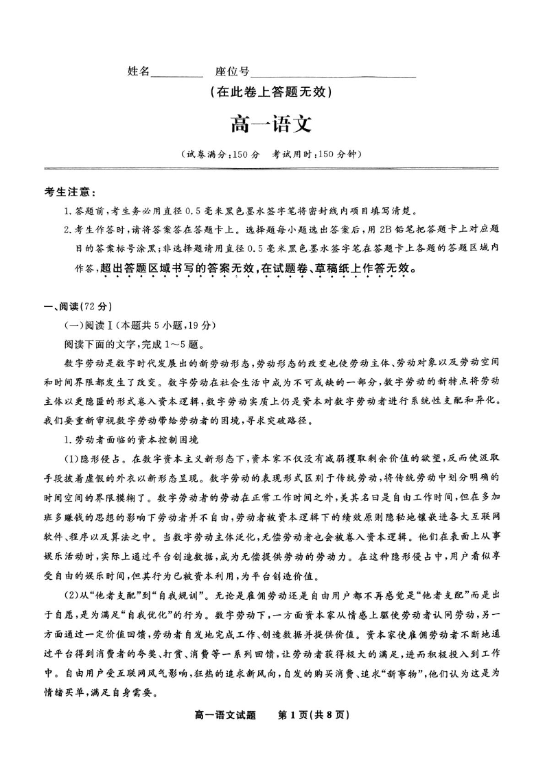 安徽省皖江名校2024-2025学年高一下学期5月月考试题语文+答案