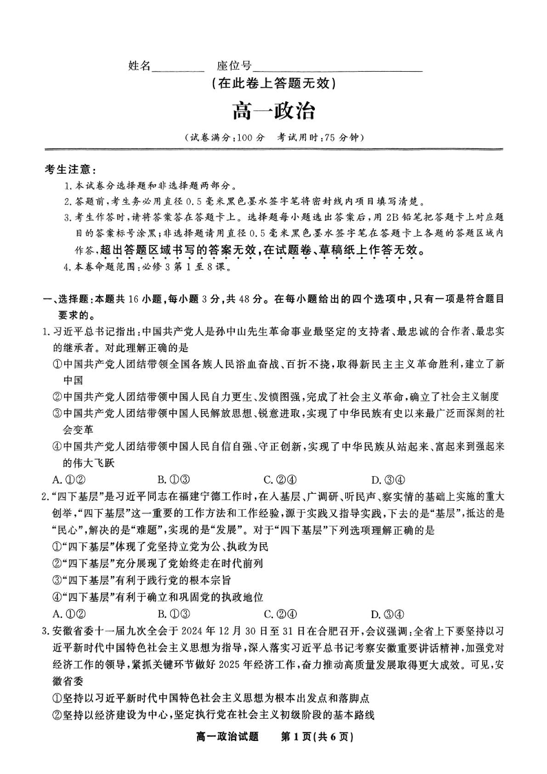 安徽省皖江名校2024-2025学年高一下学期5月月考试题政治+答案