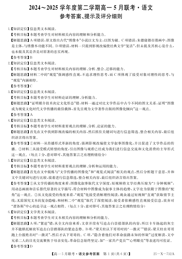 安徽省县中联盟2024-2025学年高一下学期5月联考语文答案