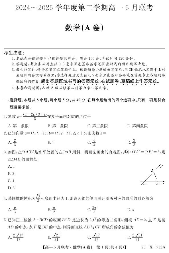 安徽省县中联盟2024-2025学年高一下学期5月联考数学(A卷)