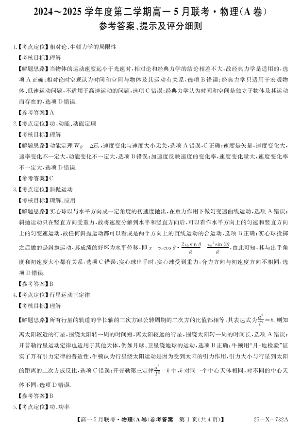 安徽省县中联盟2024-2025学年高一下学期5月联考物理(A卷)答案