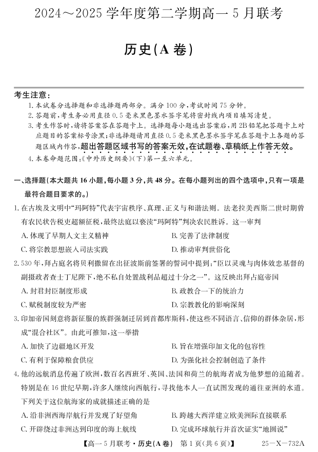 安徽省县中联盟2024-2025学年高一下学期5月联考历史(A)