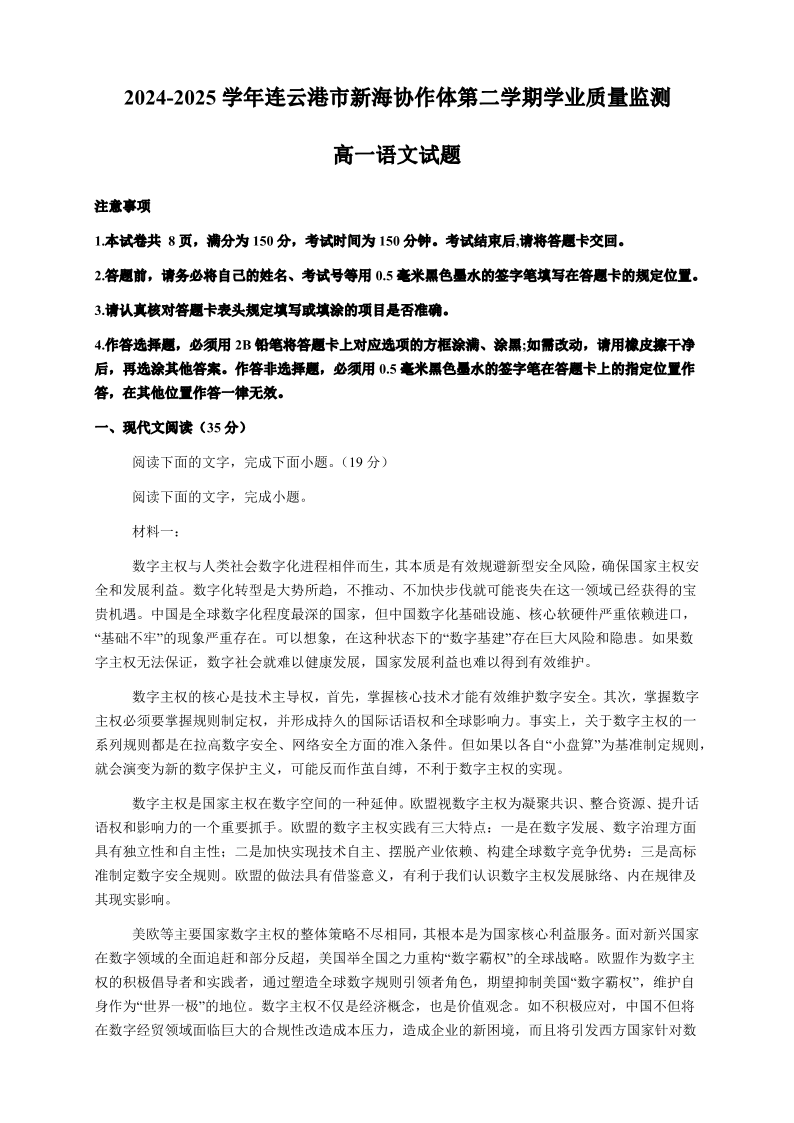 江苏省连云港市新海协作体2024-2025学年高一下学期5月学业质量监测试题语文+答案