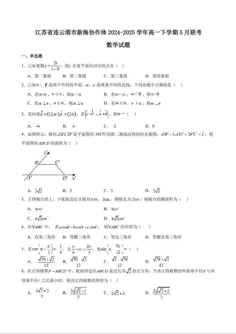 江苏省连云港市新海协作体2024-2025学年高一下学期5月学业质量监测试题数学+答案