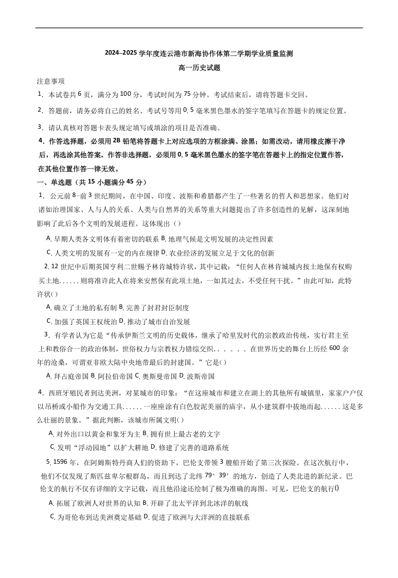 江苏省连云港市新海协作体2024-2025学年高一下学期5月学业质量监测试题历史+答案