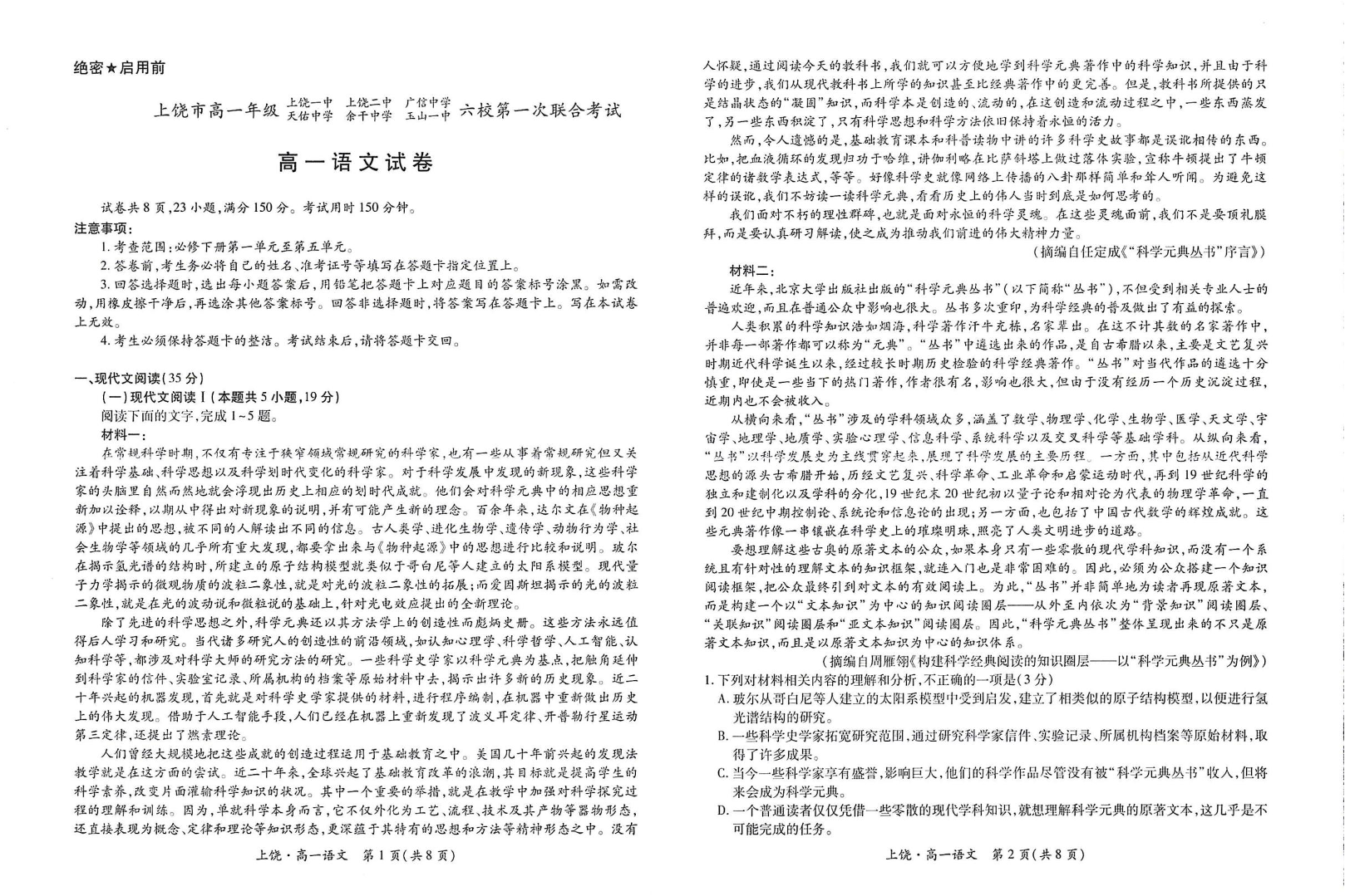 江西省上饶市六校2024-2025学年高一下学期5月第一次联合考试语文+答案