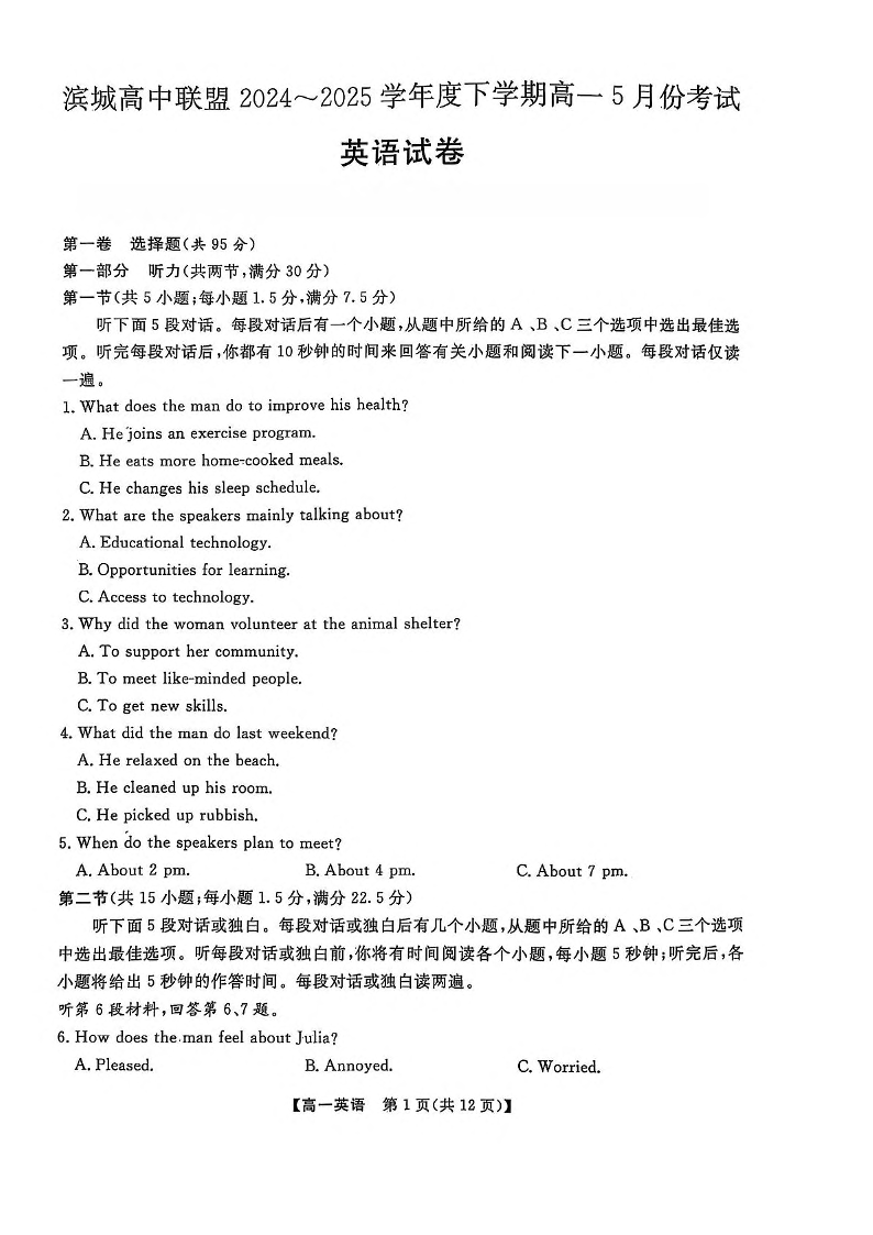 辽宁省大连市滨城高中联盟2024-2025学年高一下学期5月期中考试英语
