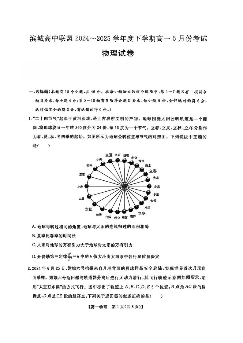 辽宁省大连市滨城高中联盟2024-2025学年高一下学期5月期中考试物理+答案