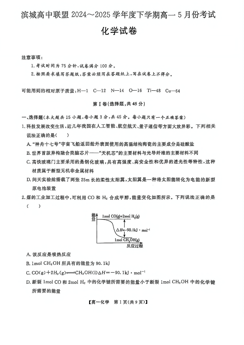 辽宁省大连市滨城高中联盟2024-2025学年高一下学期5月期中考试化学+答案