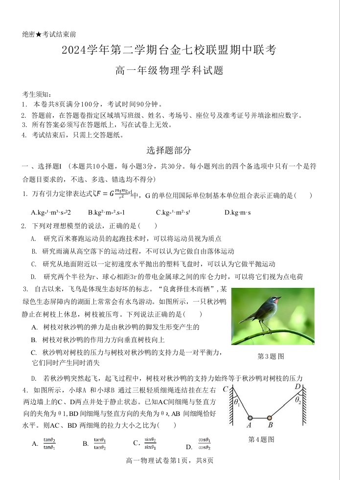 浙江省台金七校联盟2024-2025学年高一下学期5月期中联考试题物理+答案