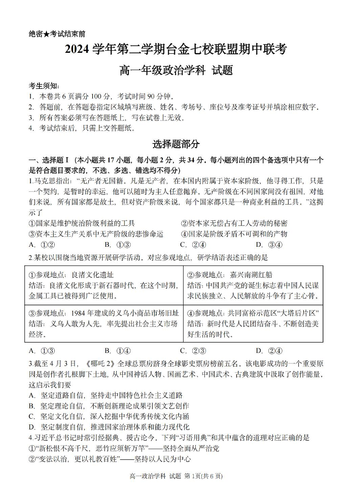 浙江省台金七校联盟2024-2025学年高一下学期5月期中联考试题政治+答案