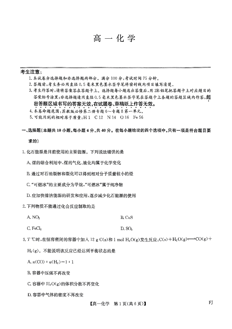 福建省福州市联盟校2024-2025学年高一下学期期中考试化学