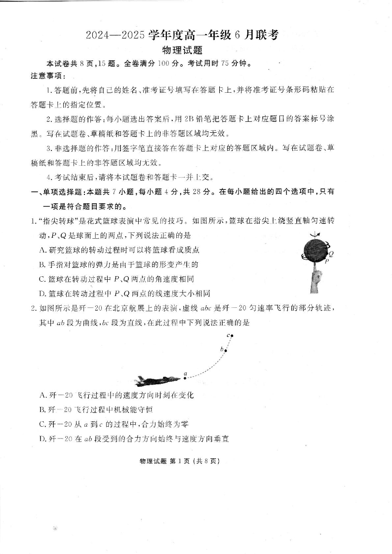 广东省部分学校2024-2025学年高一下学期6月联考物理+答案