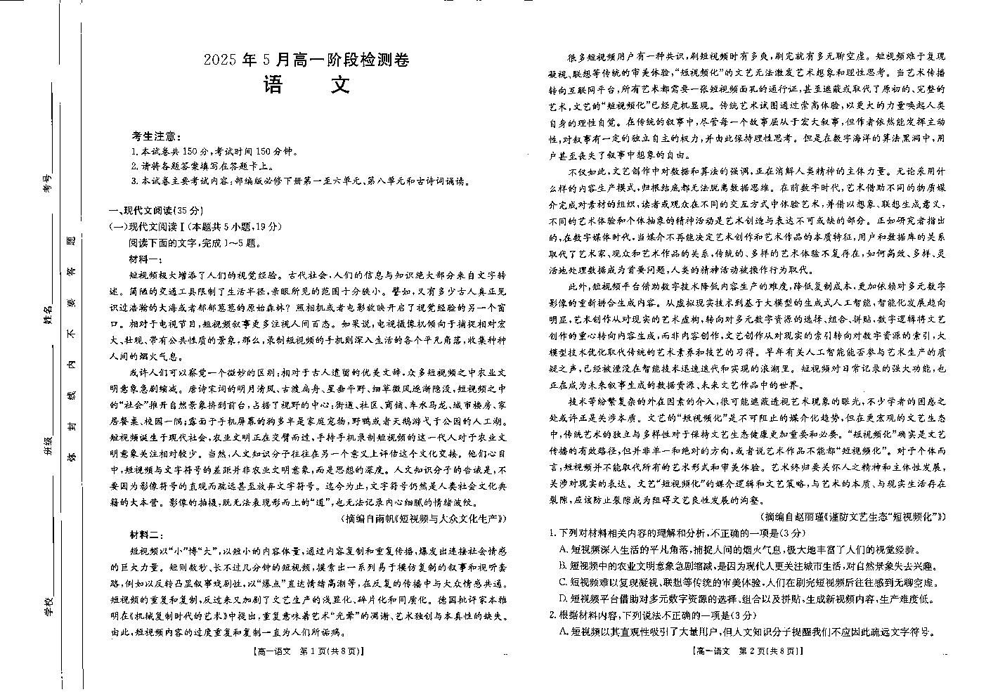 广西桂林市部分学校2024-2025学年高一下学期5月阶段检测试题语文+答案(北师大版)