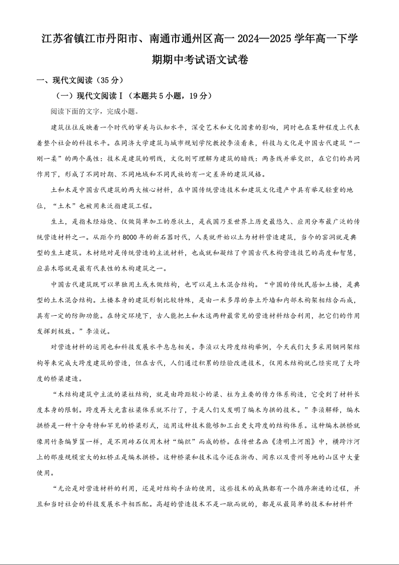 江苏省镇江市丹阳市、南通市2024-2025学年高一下学期期中考试语文+答案