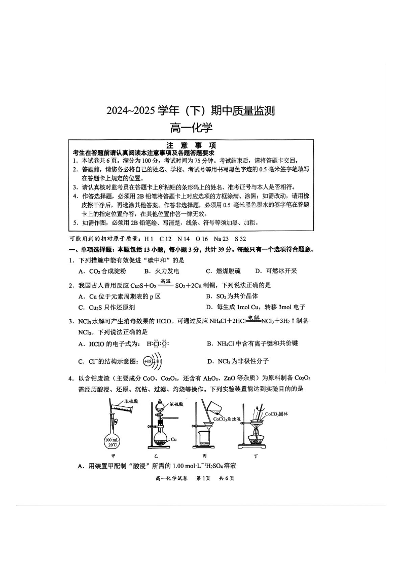江苏省镇江市丹阳市、南通市2024-2025学年高一下学期期中考试化学+答案
