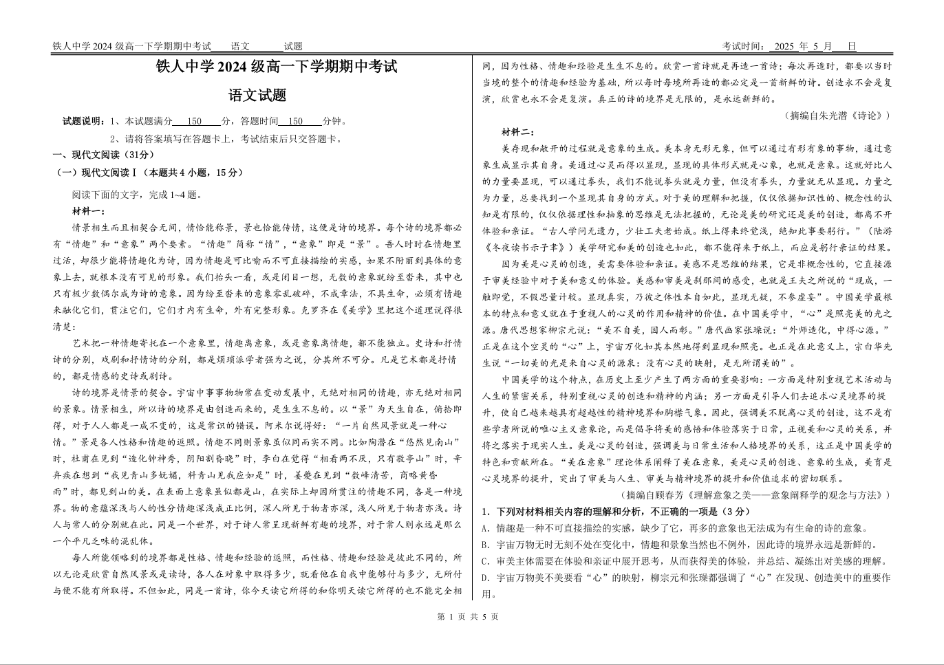黑龙江省大庆铁人中学2024-2025学年高一下学期期中考试语文