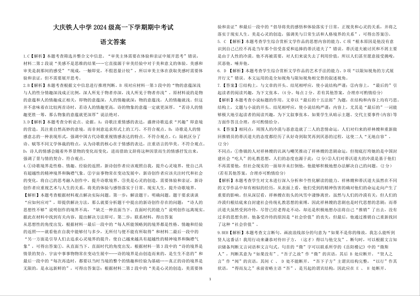 黑龙江省大庆铁人中学2024-2025学年高一下学期期中考试语文答案