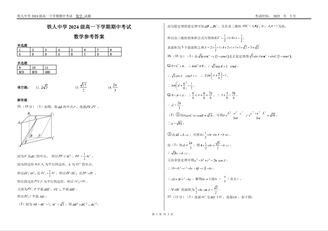 黑龙江省大庆铁人中学2024-2025学年高一下学期期中考试数学答案