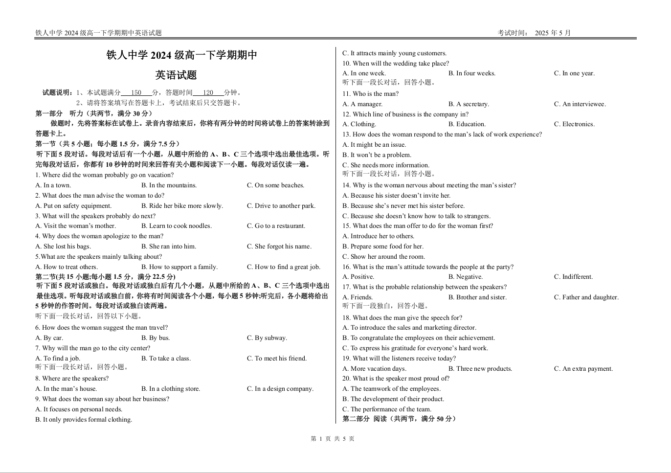 黑龙江省大庆铁人中学2024-2025学年高一下学期期中考试英语