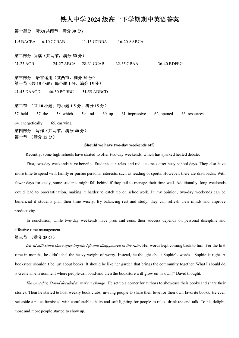黑龙江省大庆铁人中学2024-2025学年高一下学期期中考试英语答案