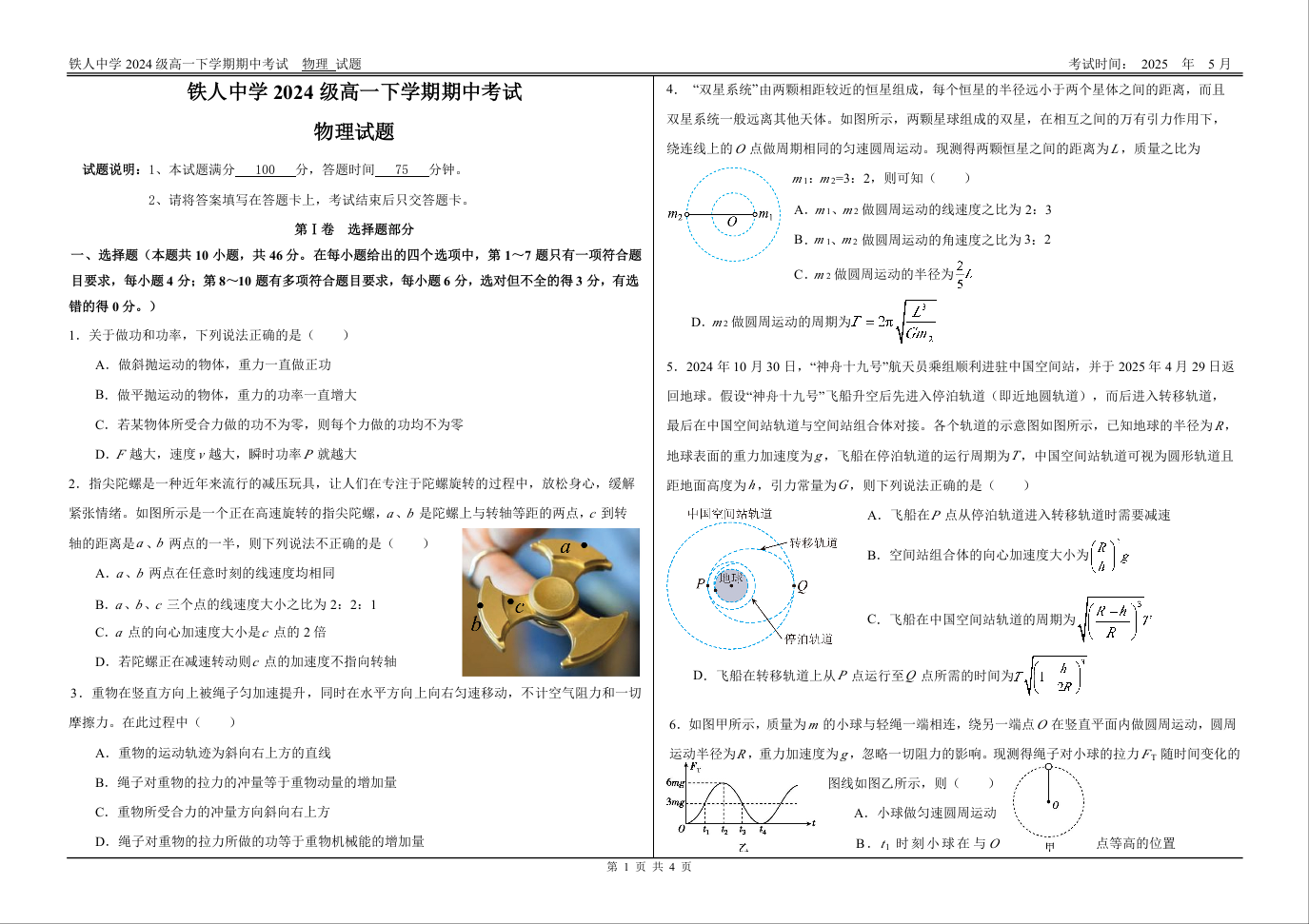 黑龙江省大庆铁人中学2024-2025学年高一下学期期中考试物理