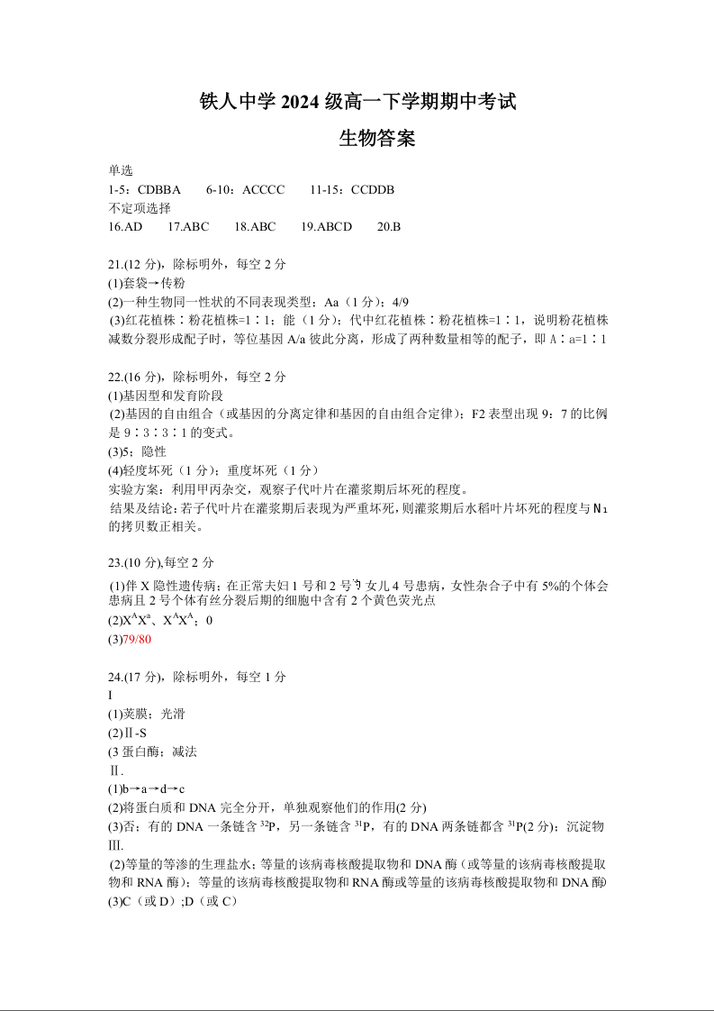 黑龙江省大庆铁人中学2024-2025学年高一下学期期中考试生物答案