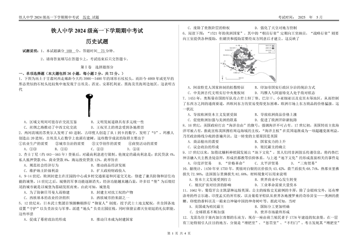 黑龙江省大庆铁人中学2024-2025学年高一下学期期中考试历史