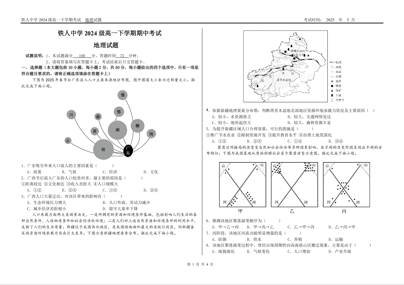 黑龙江省大庆铁人中学2024-2025学年高一下学期期中考试地理