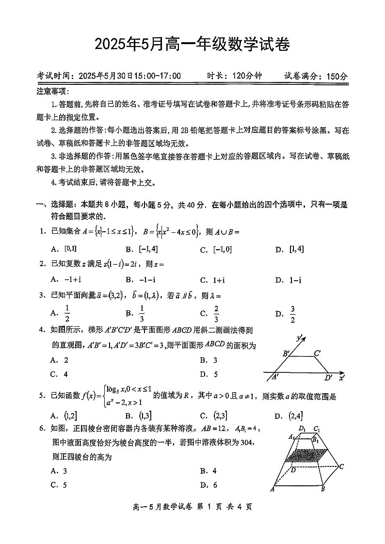 湖北省云学联盟2024-2025学年高一下学期5月月考数学+答案