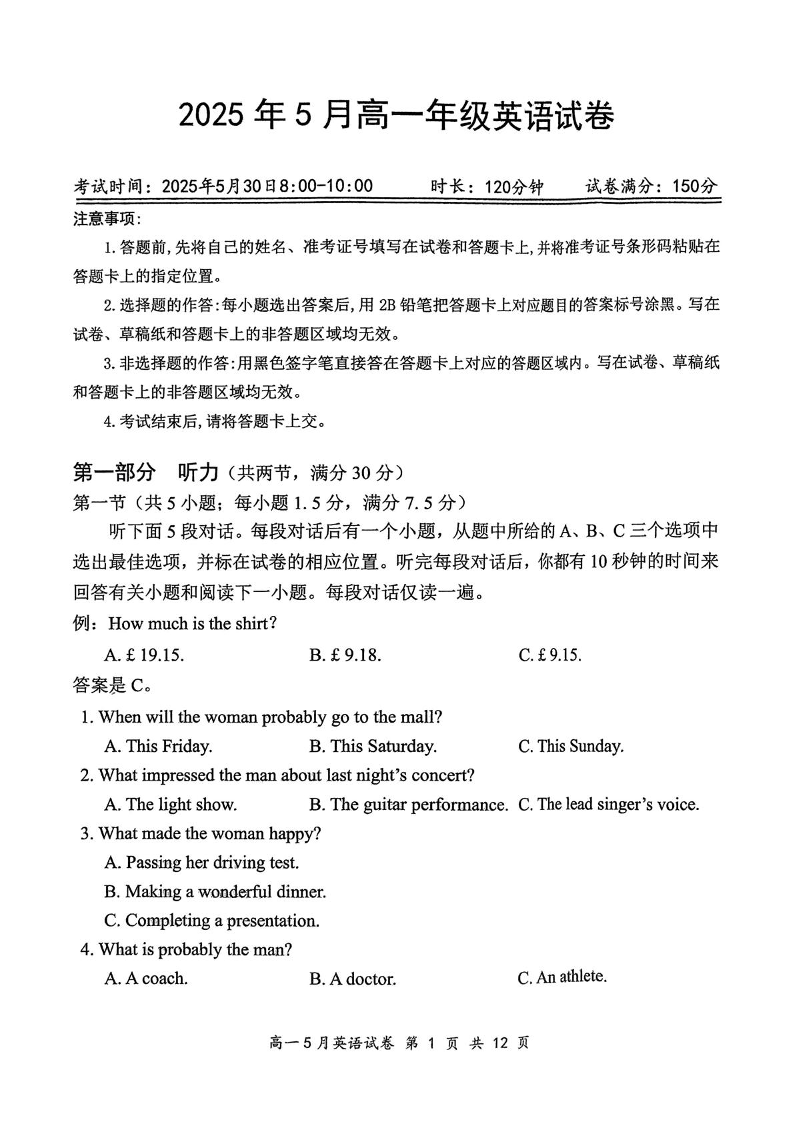 湖北省云学联盟2024-2025学年高一下学期5月月考英语