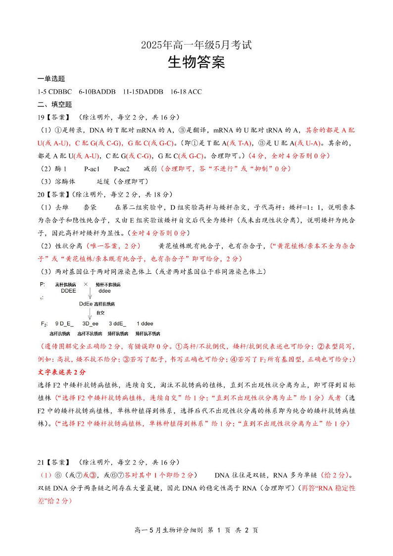 湖北省云学联盟2024-2025学年高一下学期5月月考生物答案
