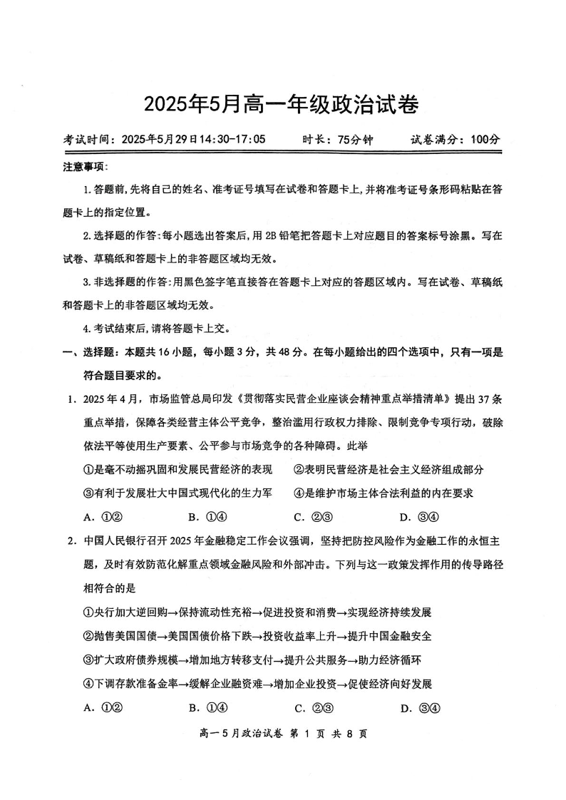 湖北省云学联盟2024-2025学年高一下学期5月月考政治