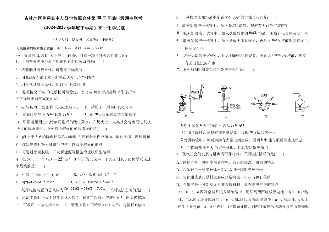 吉林地区普通高中友好学校联合体2024-2025学年高一下学期期中考试化学+答案