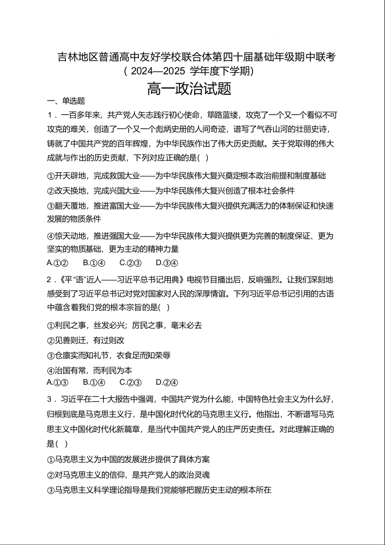 吉林地区普通高中友好学校联合体2024-2025学年高一下学期期中考试政治+答案