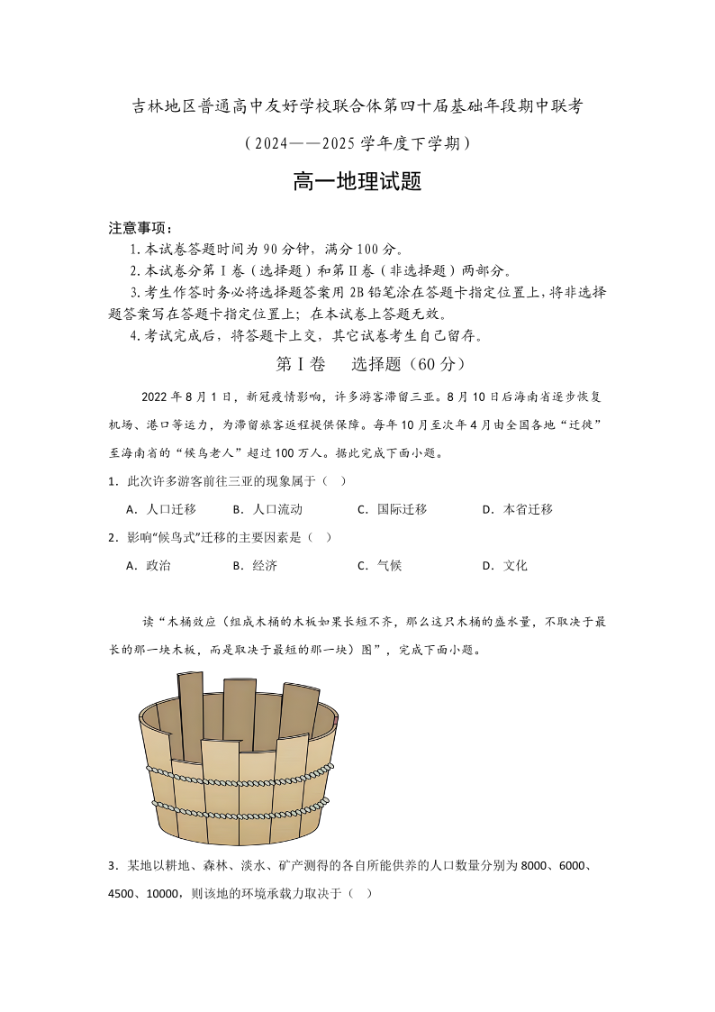 吉林地区普通高中友好学校联合体2024-2025学年高一下学期期中考试地理+答案