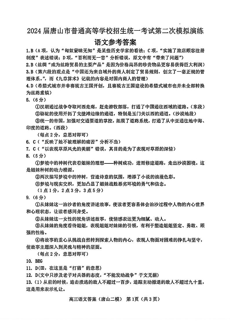 河北省唐山市2024届高三下学期二模考试(唐山二模)语文答案
