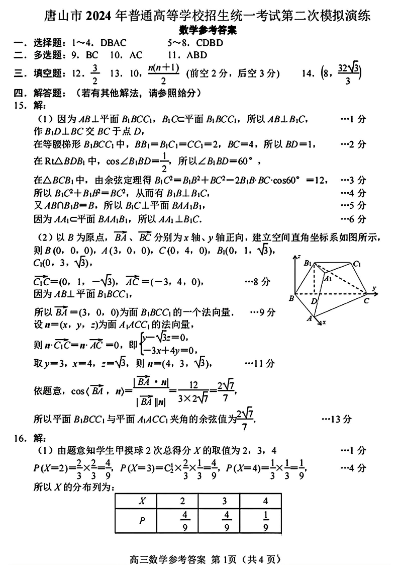 河北省唐山市2024届高三下学期二模考试(唐山二模)数学答案