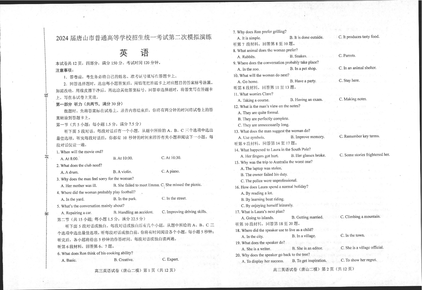 河北省唐山市2024届高三下学期二模考试(唐山二模)英语