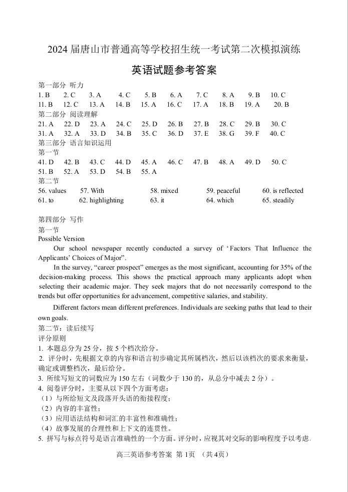 河北省唐山市2024届高三下学期二模考试(唐山二模)英语答案