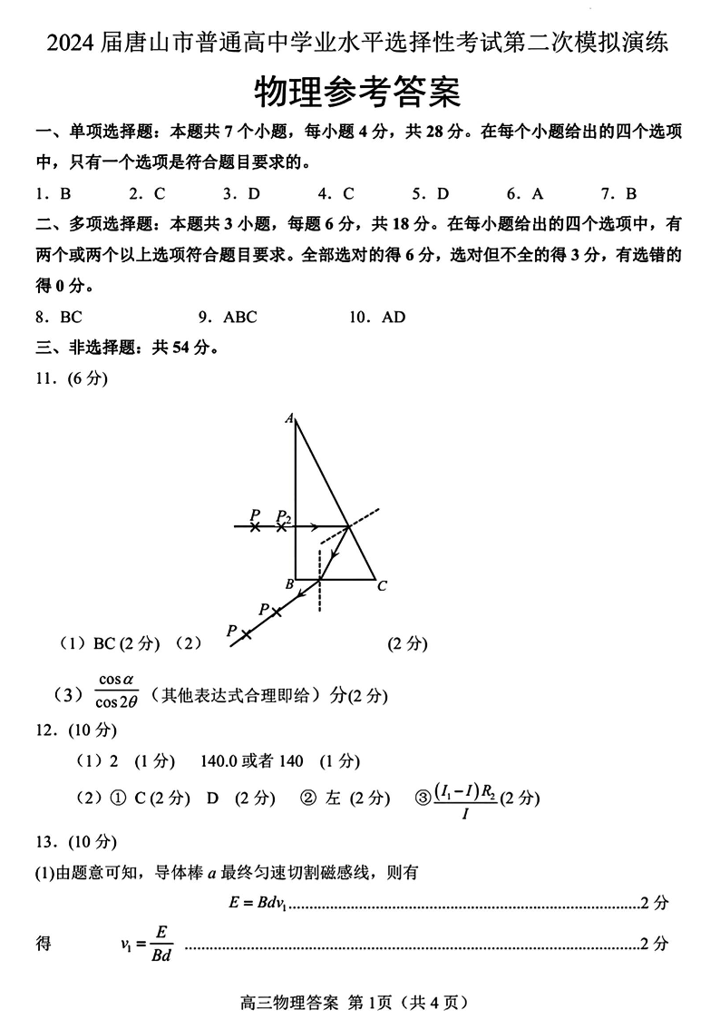 河北省唐山市2024届高三下学期二模考试(唐山二模)物理答案