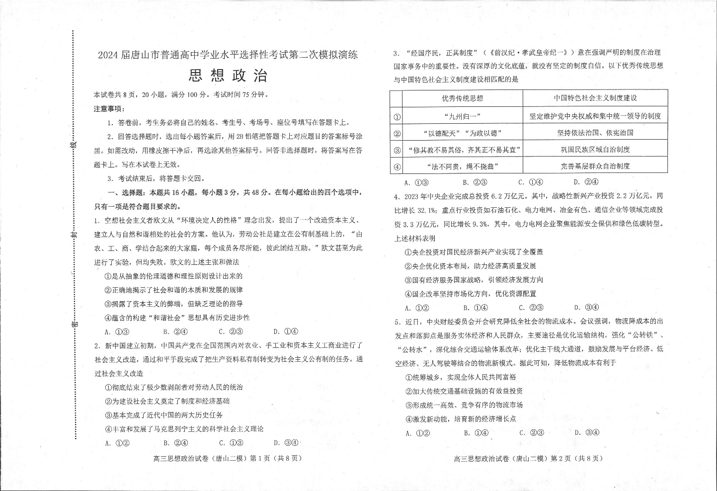 河北省唐山市2024届高三下学期二模考试(唐山二模)政治