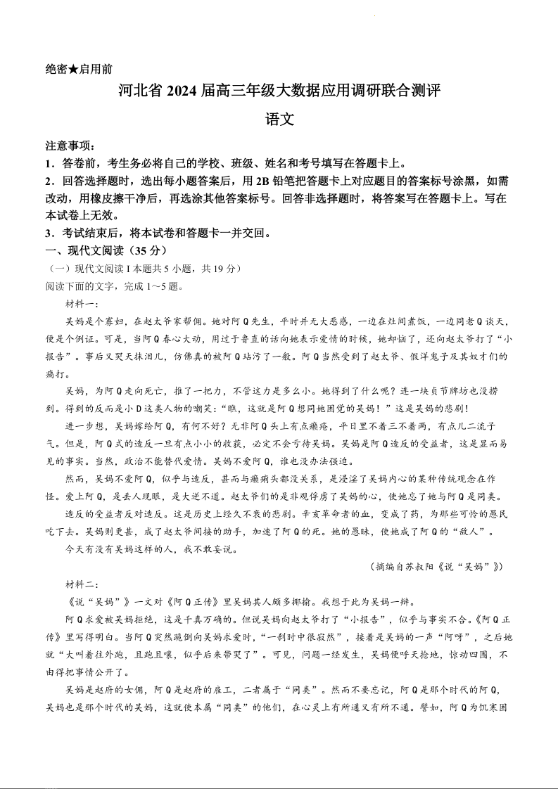 河北省雄安新区雄安部分2024届高中高三下学期一模语文+答案