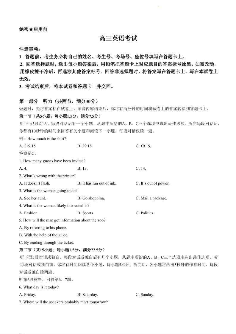 河北省雄安新区雄安部分2024届高中高三下学期一模英语+答案