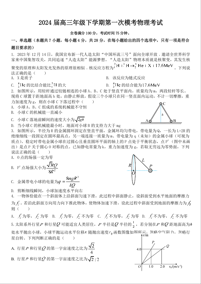 河北省雄安新区雄安部分2024届高中高三下学期一模物理+答案