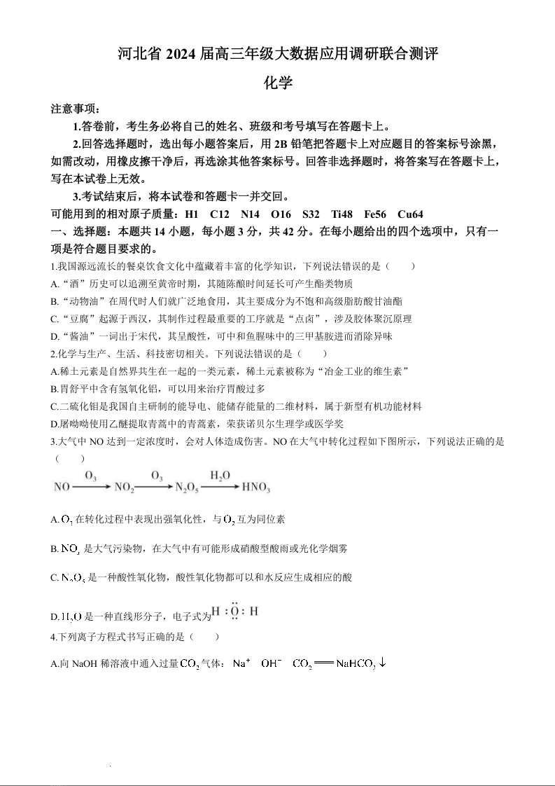 河北省雄安新区雄安部分2024届高中高三下学期一模化学+答案